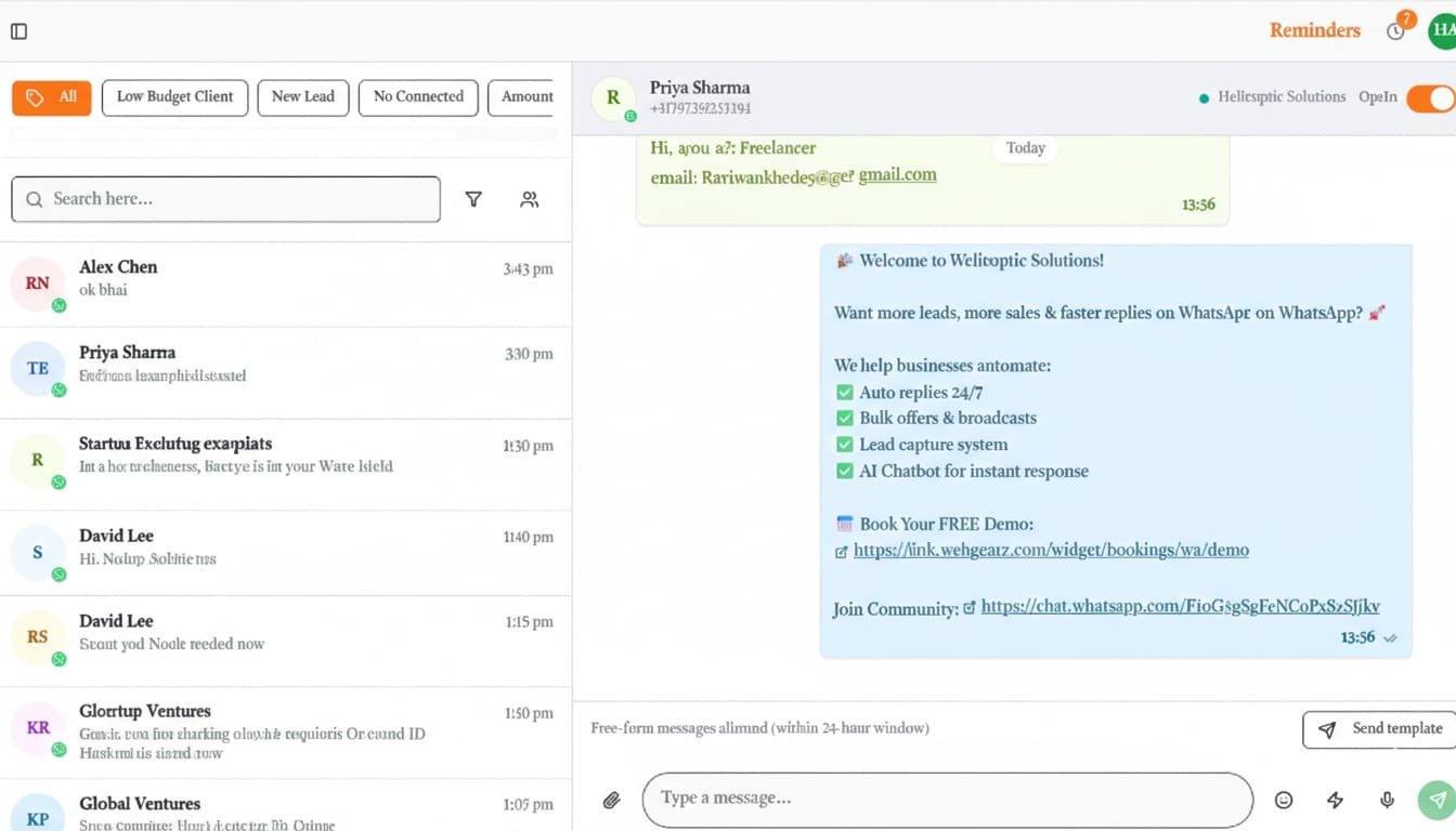 Manage all your WhatsApp conversations in one unified inbox. Filter by lead status, search contacts, and engage with customers through real-time chat.